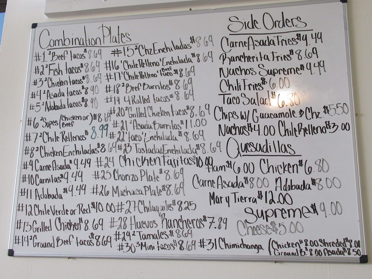 any choice of meat: chicken, gtround beef, asada,carnitas, adovada, alpastor, tripa, lengua